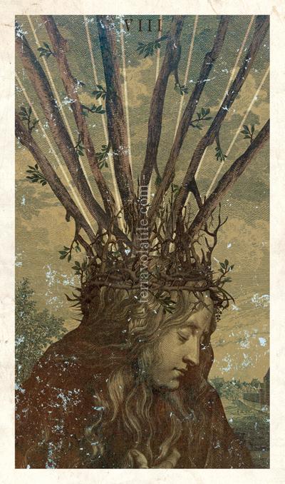 The alternative card portrays someone who had challenging times (as seen in the Seven of Wands) that can be defined by the crown of thorn on her head. However, if you look closely, the thorns grew some green leaves and expanded greatly in the air. In this card, the skies are also open and unobstructed to allow your fast spreading.